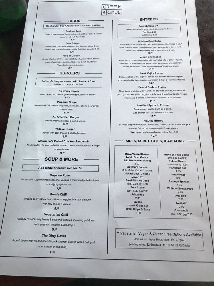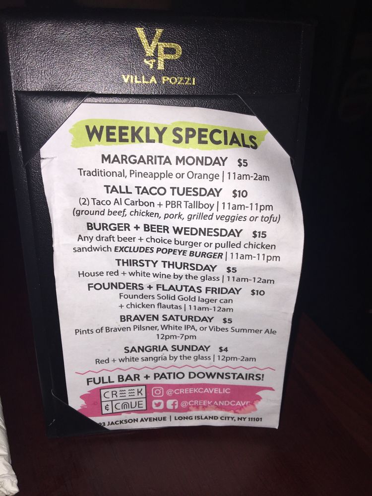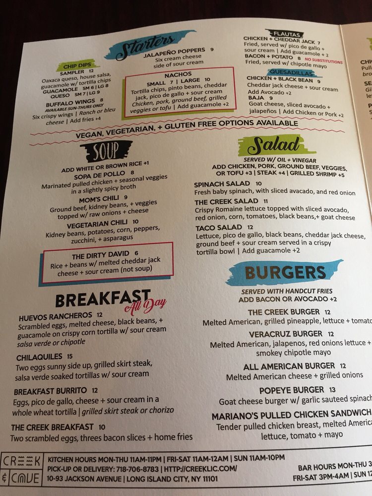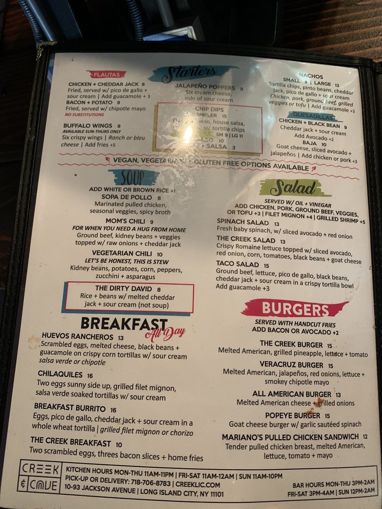 The Creek & The Cave, located in Long Island City, offers a unique dining experience blending food, drinks, and entertainment. With options for reservations, delivery, and takeout, along with vegan offerings, this restaurant caters to a wide range of preferences. The cozy atmosphere, complete with outdoor seating, makes it ideal for groups and late-night gatherings. The menu features tasty dishes like chicken enchiladas with zesty salsa verde, complemented by a selection of well-priced drinks during happy hour. The venue boasts a downstairs bar/stage for comedy shows, creating a lively ambiance. Despite some mixed reviews on pricing, the overall consensus praises the friendly service and the enjoyable dining experience. For a casual yet entertaining night out, The Creek & The Cave offers a memorable dining experience in Long Island City.